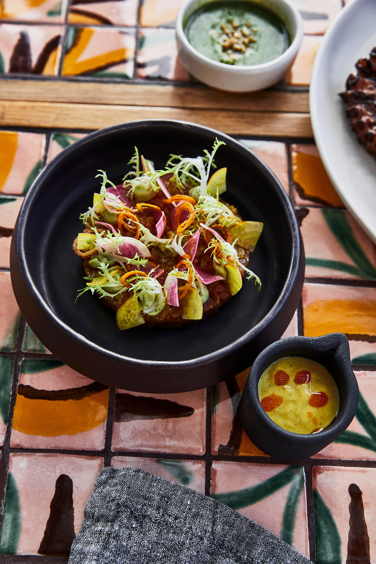 The dish is composed of a whole chargrilled local king octopus, marinated with fresh local herbs and citrus from Yucatán and served with a pepita (pumpkin seed) and chaya leaf ‘pesto’. Chaya has been greatly used ever since the Mayan era, as its herbaceous flavour is similar to spinach. It complements the richness and creaminess of the emulsified pepita, while xcatic sweet pepper brings just enough heat. We serve it with a grilled lime and freshly made tortillas, made out of local criollo corn.