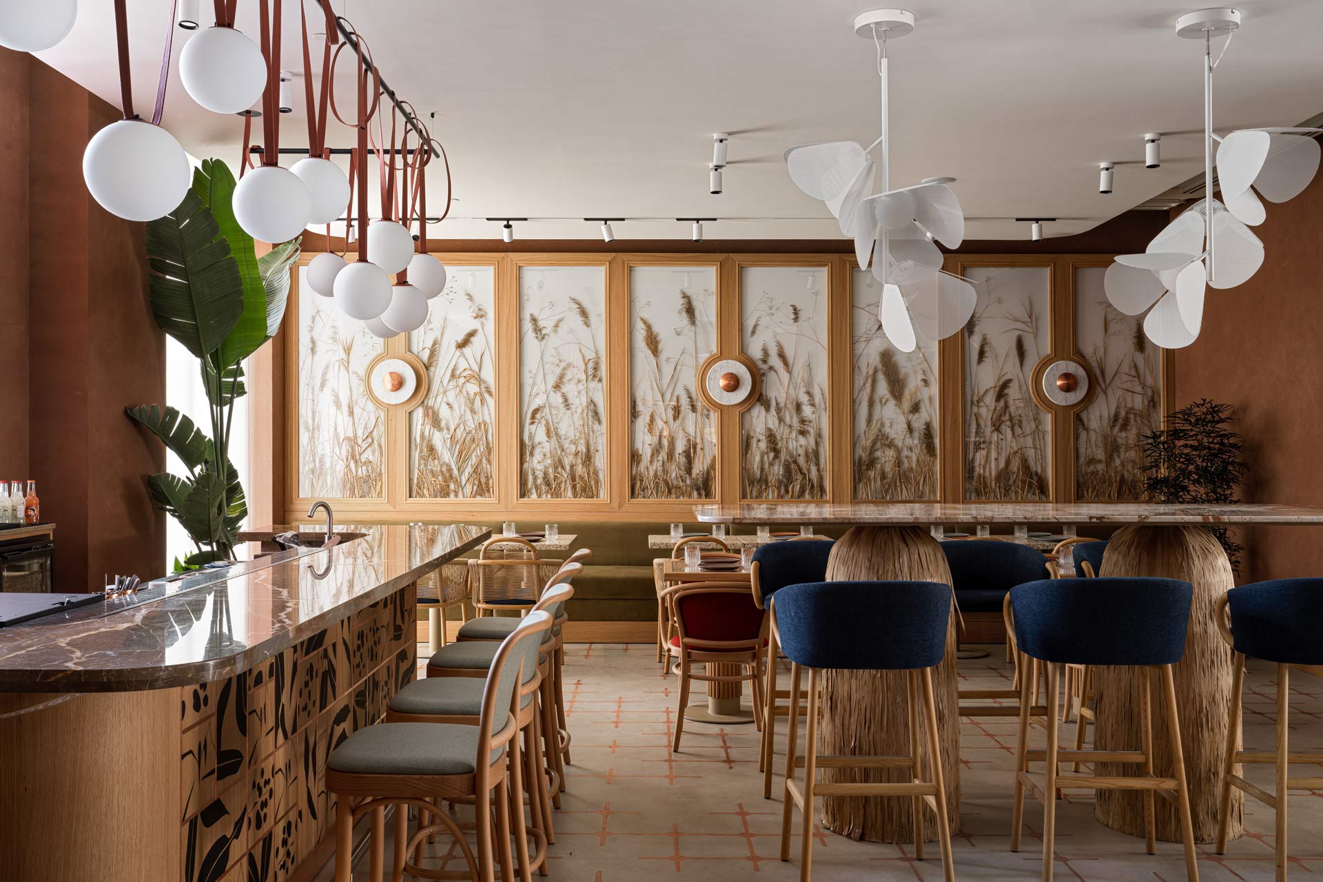 The project embodies the restaurant’s Mediterranean and Middle Eastern cuisine, with interiors that encompass soil, sea and wider nature, through tones of warm terracotta and vibrant burgundy, as well as soft natural greens and blues.