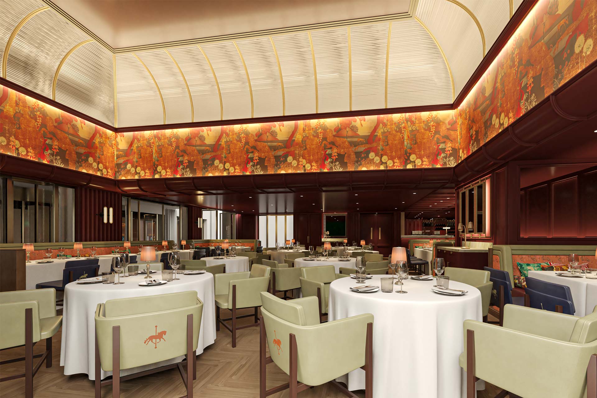 On the ground floor, Fayre is a 75-cover modern brasserie serving seasonal dishes throughout the day. The interior is defined by banquette seating, dark timber panelling and a rich berry-toned palette. Wall coverings by urban artist Adam Ellis animate the space with theatrical scenes. Referencing the historic fair that once occupied Mayfair’s open fields, these artworks reinterpret the original gatherings, from livestock markets and theatres to jugglers and games of chance.