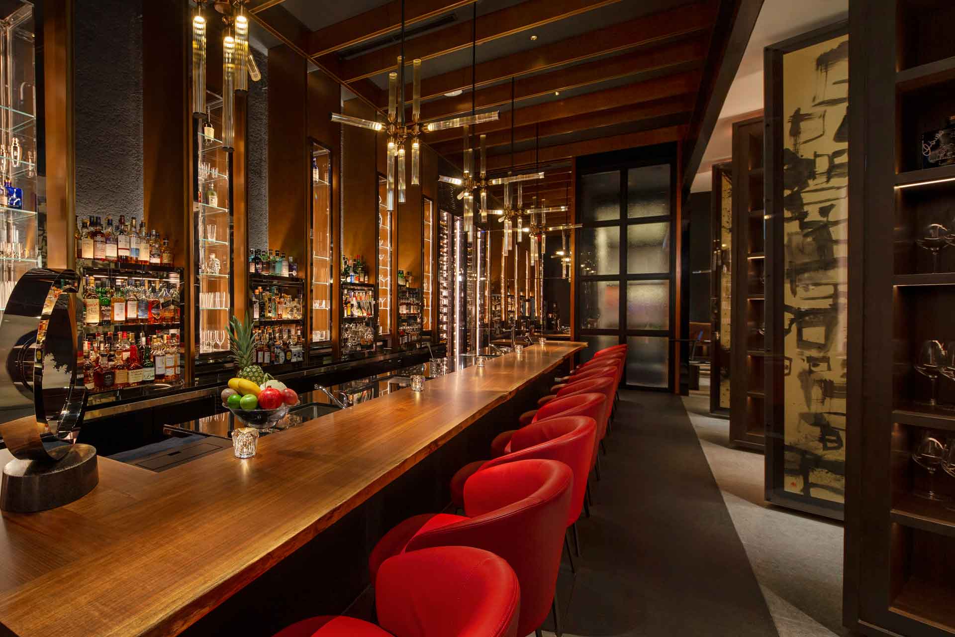 Time-honoured carpentry by craftsmen from Shikoku, Japan, is imbued in a dining table at the chef’s table room, forged using Kaba Zakura (Japanese cherry) with natural wood lines.
