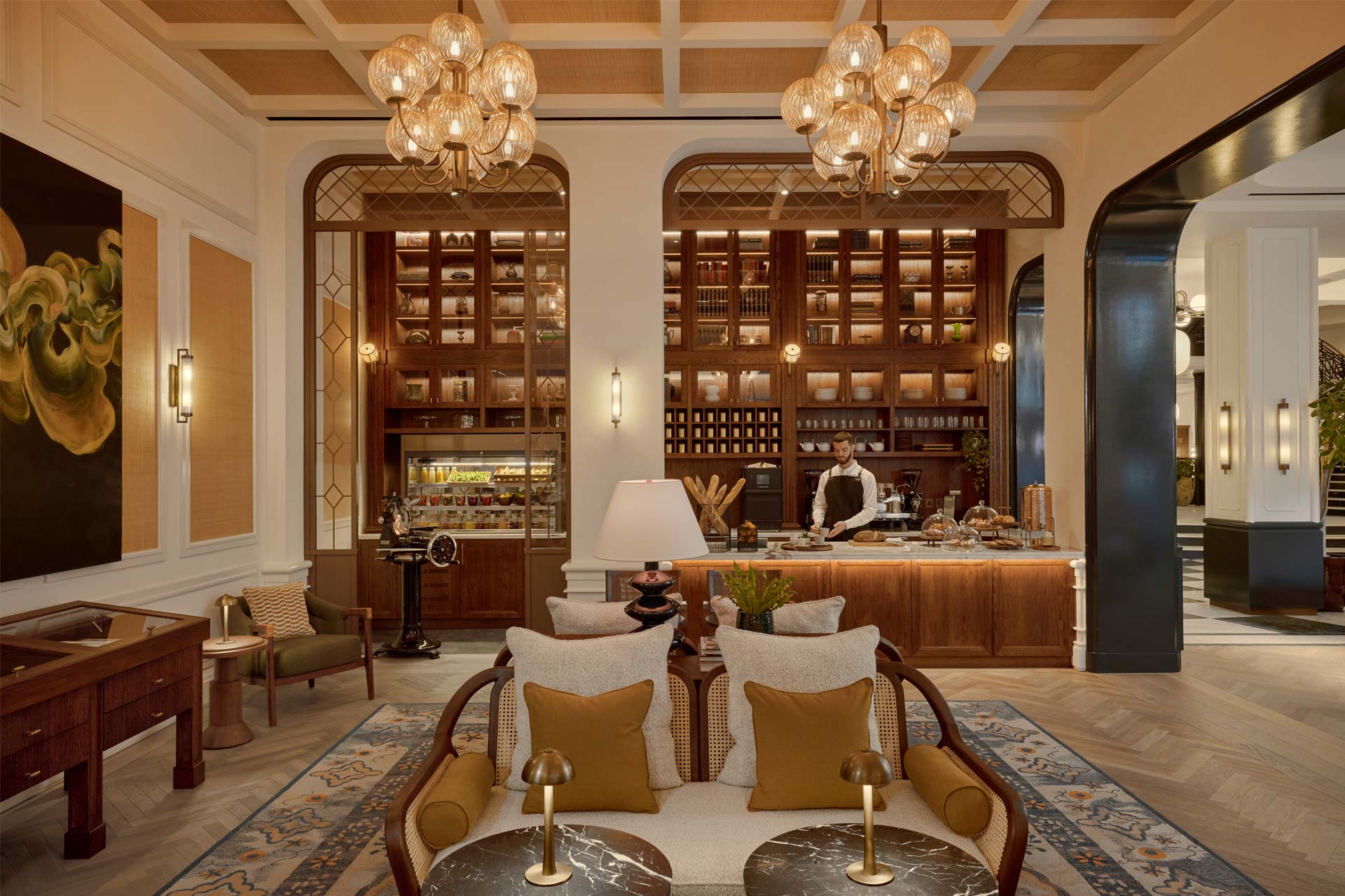 Designed by AvroKO, with architecture by EPR Architects, guests enter through a working show kitchen anchored by a central farmhouse table before moving into light-filled spaces inspired by early European cafés.